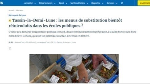 Aujourd'hui, lors de l'audience, la rapporteur publique dont le rôle est d'exposer publiquement et en toute indépendance son analyse, afin d'éclairer la formation du jugement, a demandé au tribunal l’annulation de la décision du maire de Tassin-la Demi-Lune et la réintroduction des menus de substitution dans les écoles publiques.