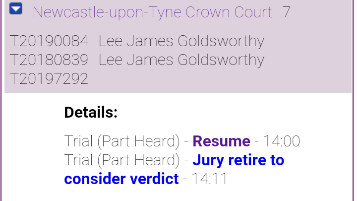 On Friday, there was too much evidence for a Verdict at that stage so today the Jurys have retired for a Verdict and Lee James Goldsworthy will rather be found Guilty and imprisoned or Not Guilty and released.