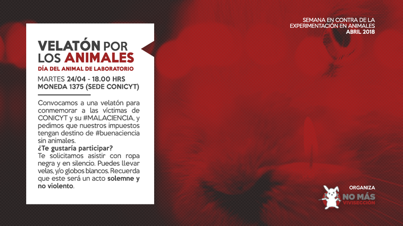El 24 de abril a las 18 hrs. los invitamos a participar de esta convocatoria para conmemorar el Día del animal de laboratorio frente a las oficinas del Conicyt en Moneda 1365.
