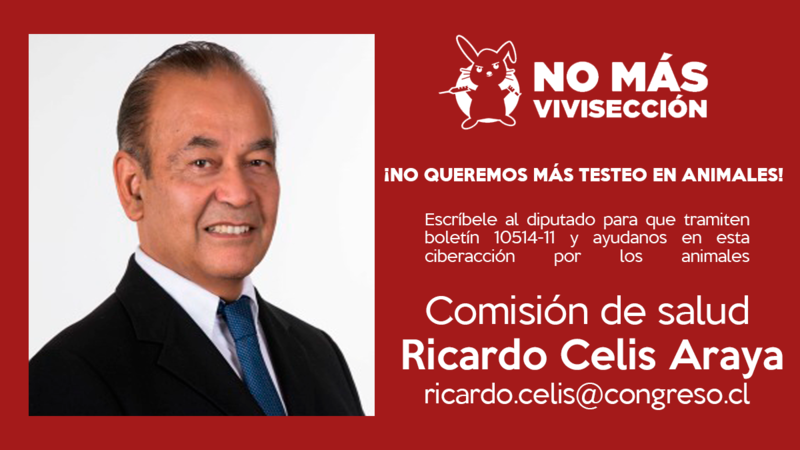 Escribe al integrante de la Comisión de salud de la Cámara de Diputados, Ricardo Celis Araya, mediante una carta solicitando que se tramite el proyecto de ley (boletín 10.514-11) que prohíbe el testeo en animales para cosméticos.