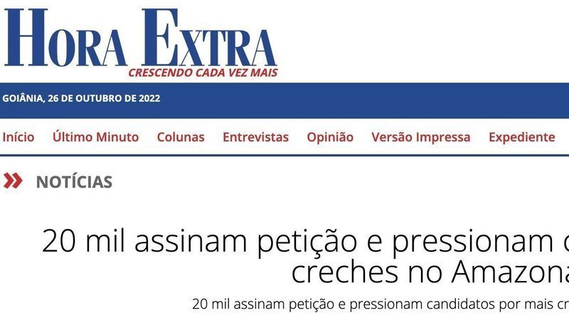 Aviso de atualizaçãoMais de 250 mil crianças estão desamparadas! Precisamos de creches!Saiu no Hora Extra! 20 mil assinam petição e pressionam candidatos por mais creches no Amazonas