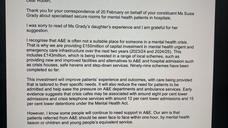 Maria Caulfield has responded to my question about urgent support needed in A and E departments when someone is suicidal. Unfortunately there is a long way to go.