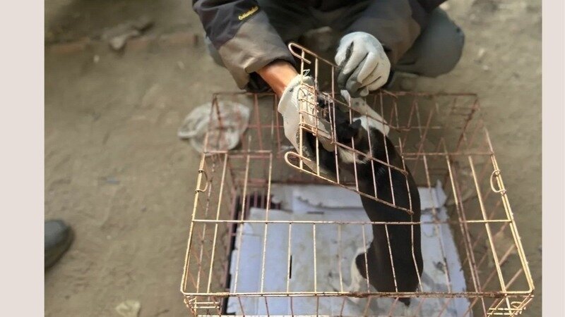 Ein kleiner Hund, dessen Bein zerquetscht wurde, weil er in einen grausamen Fleischmarktkäfig gestopft wurde, konnte nach einer Razzia von NoToDogMeat gerettet werden.