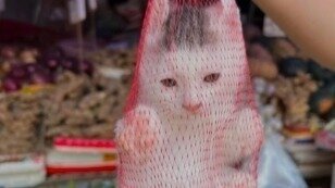 Katze im Einkaufsnetz am Fleischmarkt zum fressen gekauft .. getötet wird daheim.:(
