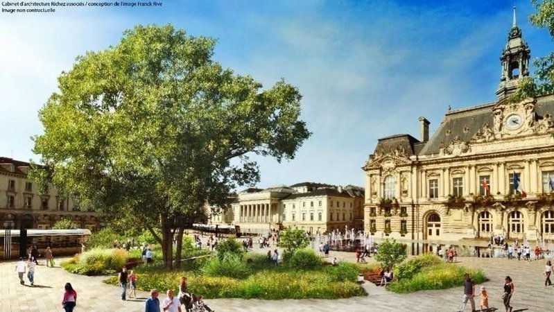 Quand je vois la représentation imaginée par le cabinet d'architecte Richez et monsieur Frank Rive de la nouvelle place Jean-Jaurès que la ville nous vend, je m'aperçois que ce dessin ne représente que le coté face à la mairie et que l'on se garde bien de montrer aux tourangeaux le coté face au palais de justice qui deviendra une grande place vide de tout avec seulement des rails qui viennent en tournant du nord, du sud et de l'ouest, une vraie gare de triage de tramway en plein cœur de Tours. Cela va être magnifique!