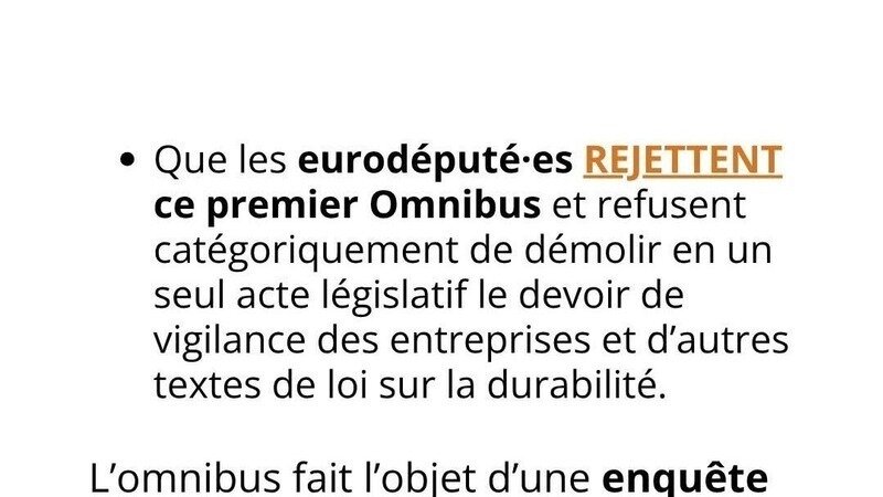 Ce texte, qui répond directement à l’injonction des lobbies pétroliers comme Total et ExxonMobil, et des puissances étrangères comme l’Administration Trump et le Qatar, pourrait vider de sa substance la directive sur le devoir des vigilances des entreprises, pilier du Green Deal voté il y a moins de deux ans. Ce texte permettait de rendre responsables les entreprises des crimes environnementaux et sociaux commis dans le cadre de leurs activités ou celles de leurs partenaires. Le vote sur cette directive Omnibus I est un test de résistance des parlementaires européens face aux pressions étrangères et des lobbies industriels. C’est le premier Omnibus d’une longue série visant à déréguler un à un les engagements du Green Deal. Cet Omnibus est considéré comme contraire aux traités de l’Union par une centaines de professionnels du droit européen.