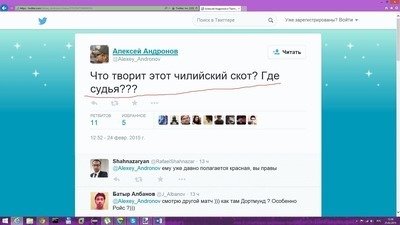 During the last game between Borussia D. and Juventus teams within 1/8 of Champions League finals, Alexey Andronov in a rush of emotions did not keep his temper and showed the real face as he seeded a number of statements on his "twitter" account; those statements are far beyond a foul line, and one of them totally crosses all admissible limits for a public figure and professional commentator (who happens to be the face of "NTV Plus").