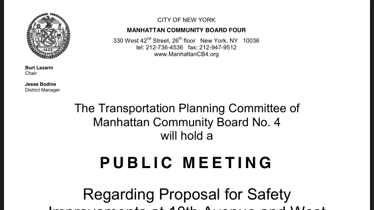 Petition updateTransportation Safety Improvements NOW - 10th Ave. @ W 41st St.Sept. 13th - Thurs - CB4 wants to hear YOU!