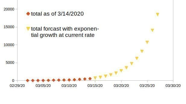 Assuming the same exponential growth rate of total cases from 3/2/2020 (1 confirmed case) to 3/14/2020 (524), we are expecting to have 25,000 cases by 3/30/2020 in NY state. This estimate does not consider the impact from limited testing.