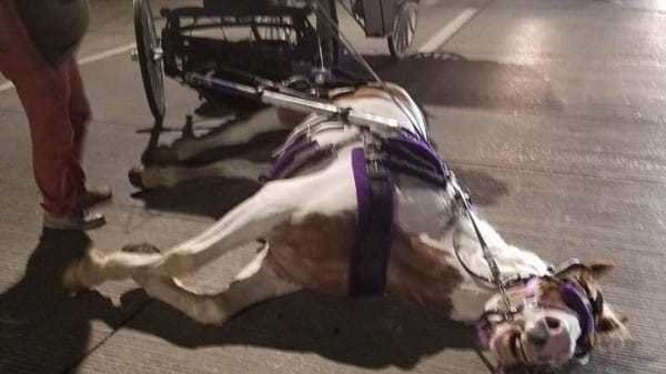 horse collapses in the middle of the road from exhaustion. stop carriage rides in NYC.