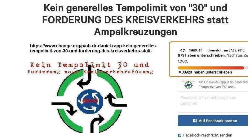 zu Beginn der kommenden Woche, werde ich nun die Gesamtliste der Online-Unterschriften für die Petition zum Thema "Generelles Tempolimit 30" im Vorzimmer des Herrn Oberbürgemeisters Dr. Rapp abgeben. Es sind 873 Unterschriften. Die handschriftlichen Listen mit den 47 Unterzeichner/innen, hatte ich dem OB bereits am 7. Mai 2018 in seinem Büro überreicht. Zusammen haben sich demnach 920 Menschen nicht nur gegen ein generelles Tempolimit von 30 km/h auf Ravensburgs Hauptverkehrsadern ausgesprochen, sondern auch für die Installierung und Implementierung von Kreisverkehren an den Hauptknotenpunkten in Ravensburg.