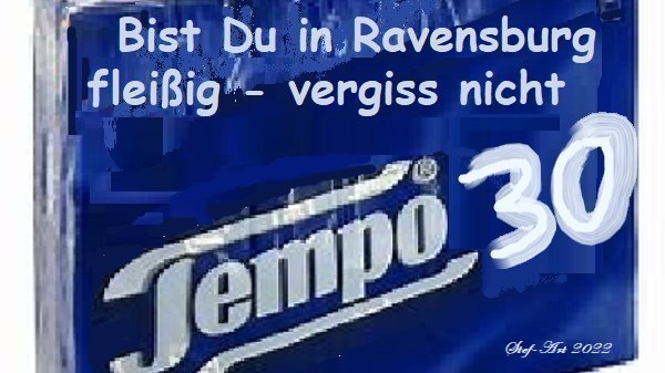 "Schatz, wieso willst du denn jetzt noch voll tanken, wir sind doch gleich zu Hause?" - "Ja, aber vorher müssen wir noch durch Ravensburg!"