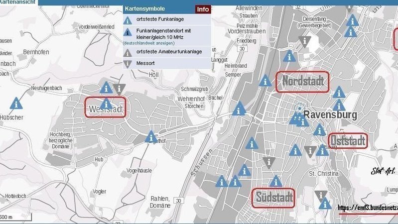Freund Winfried (vielen Dank!) machte mich gestern auf die Möglichkeit aufmerksam, herauszufinden, wo und wie viele Sendemasten aktuell in meinem und unserem Wohngebiet installiert sind. Was meine persönliche Recherche für Ravensburg dabei ergab, seht ihr auf der beigefügten Karte. Manchmal kann es Standortabweichungen von bis zu 80 Meter geben. Aber die Anzahl stimmt.