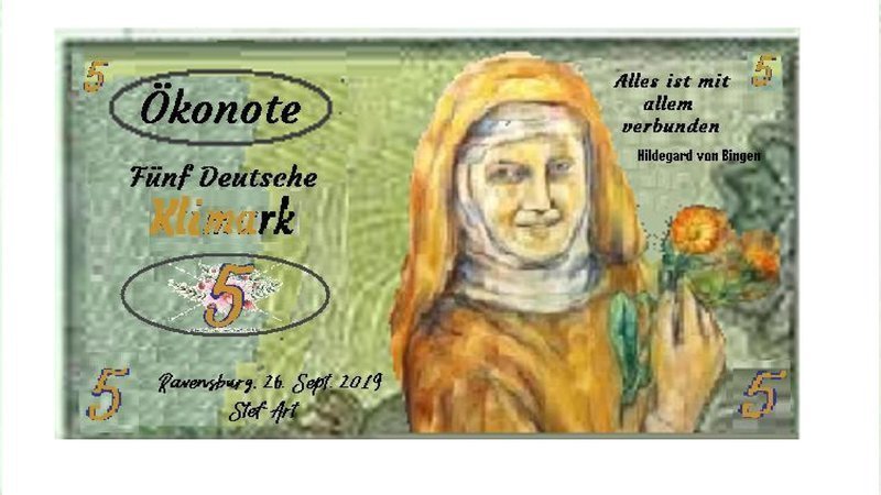 Als Anreiz habe ich die Ökonote (statt Banknote) in Höhe von 5 Deutschen Klimark (statt Mark) entworfen, die ihr Monat für Monat (eventuell auch mehrere, siehe oben) zur Seite legen könnt. Wenn ihr bei 25 Klimark angekommen seid, dann habt ihr damit schon mal eine (1) Tonne CO2 gespart.