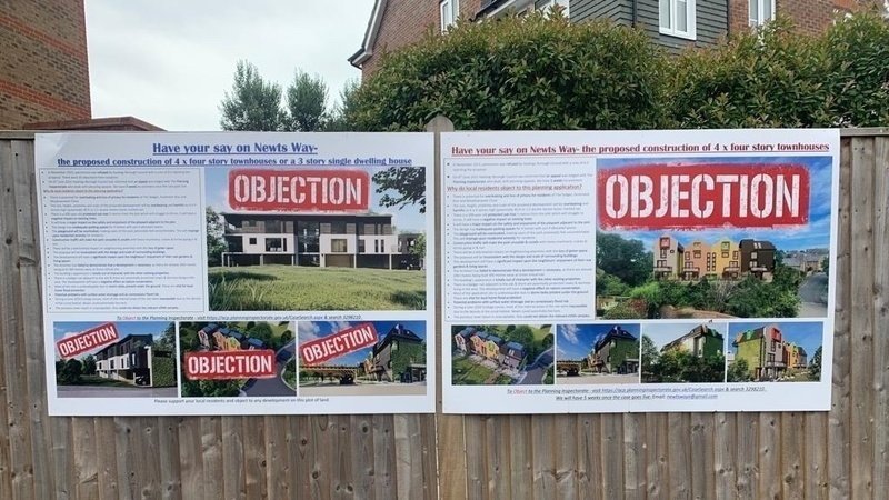 The developer became aware of 2 posters which sit on fence panels on Newts way. They are on private property and object to the development. Permission was granted by the local councillors to erect these posters of objection.