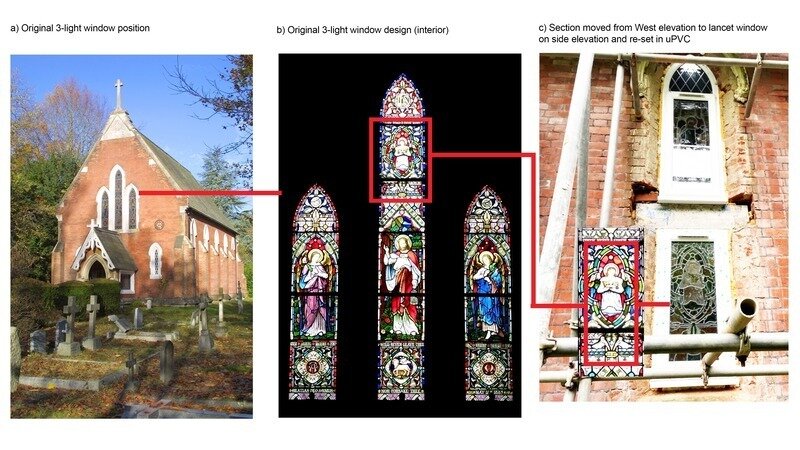 - The original stained glass was “chopped up in sections and encapsulated within new uPVC units, and the stone surrounds have been painted over.”