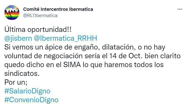 Ni un solo minuto de huelga ha hecho falta para la dirección de Ibermatica cambie su actitud, solo con la convocatoria de huelga la dirección se compromete a negociar. Pero el comité de empresa no se fía y si mañana 14 de octubre no ve voluntad de negociación se volverá a convocar la huelga.