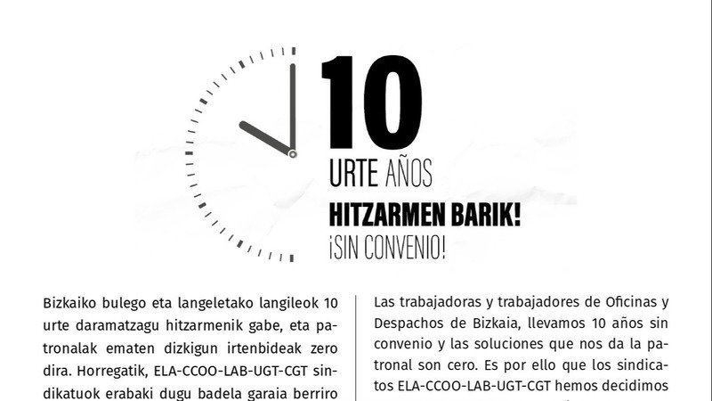 Bizkaiko bulego eta langeletako langileok 10 urte daramatzagu hitzarmenik gabe, eta patronalak ematen dizkigun irtenbideak zero dira. Horregatik, ELA-CCOO-LAB-UGT-CGT sindikatuok erabaki dugu badela garaia berriro kalera irteteko.