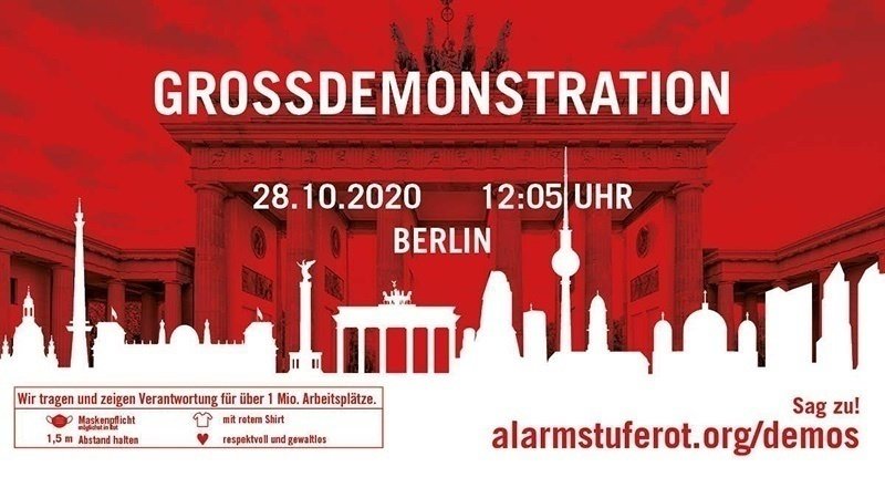 am 28.10.2020 findet um 12:05 Uhr in Berlin die nächste Grossdemonstration der Veranstaltungswirtschaft statt. Bei der letzten Demonstration im September waren knapp 15.000 Teilnehmer*innen dabei. Als Gäste auf der Bühne waren unter anderem die Band The BossHoss und der Sänger Herbert Grönemeyer geladen. Die Demonstration richtet sich NICHT gegen das Hygienekonzept der Bundesregierung sondern gegen die fehlende Unterstützung der Veranstaltungswirtschaft und Solo-Selbstständigen während der Coronakrise. Hier findet Ihr den Kurzfilm zur letzten Demo und weitere Informationen zur Demo gibt es hier: