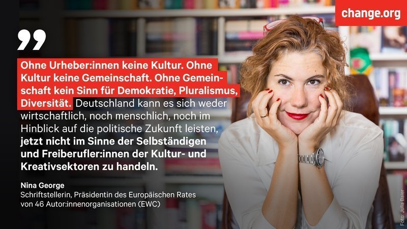 Ohne Urheber:innen keine Kultur. Ohne Kultur keine Gemeinschaft. Ohne Gemeinschaft kein Sinn für Demokratie, Pluralismus, Diversität. Deutschland kann es sich weder wirtschaftlich, noch menschlich, noch im Hinblick auf die politische Zukunft leisten, jetzt nicht im Sinne der Selbständigen und Freiberufler:innen der Kultur- und Kreativsektoren zu handeln. Nina George, Schriftstellerin, Präsidentin des Europäischen Rates von 46 Autor:innenorganisationen (EWC).