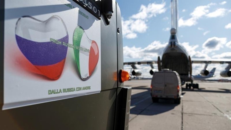 Es war bereits Nacht in Italien, als die olivgrünen Lastwagen langsam aus den soeben gelandeten Flugzeugen rollten. Die Aufkleber aber waren deutlich zu erkennen: zwei Herzen, in den jeweiligen Nationalfarben Russlands und Italiens. Darüber die Botschaft "From Russia with Love." Aus Russland - mit Liebe.