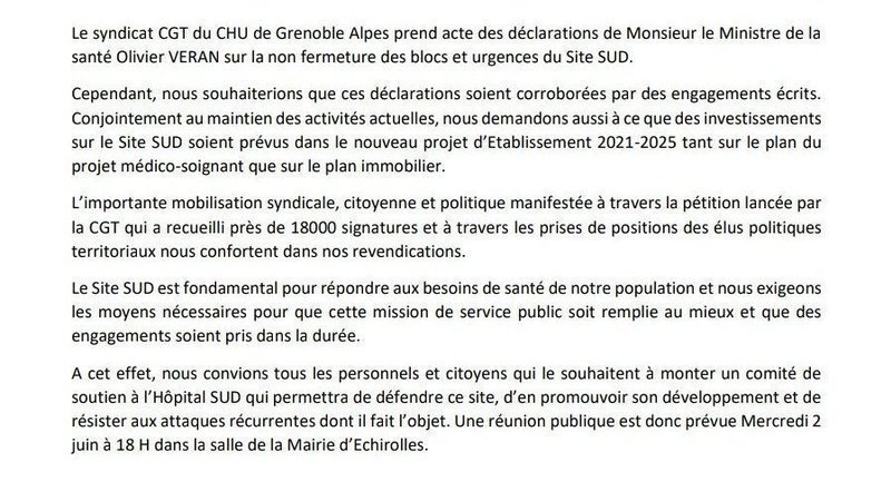Actualización de la peticiónNon à la fermeture des blocs opératoires du CHU Grenoble Alpes site Sud (Echirolles)Communiqué de presse