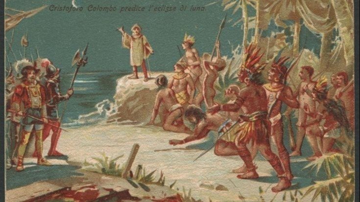 In spite of all these objections to the famous explorer, I wish to bring up an important story from the biography of Columbus, one you have probably heard, and one that relates to an eclipse, except that, in this story, the eclipse was a lunar eclipse. Due to worms eating his ships, Columbus and his crew had to stay with a tribe of natives known as the Arawak in what is now called Jamaica. The Arawak were hospitable at first, but after a while, the Europeans wore out their welcome, and the natives stopped giving the castaways food. Now, Columbus had an almanac that all sailors would have carried at the time, an almanac that contained valuable data about the sun, moon, and stars. This almanac predicted that there was to be a total lunar eclipse. Columbus told the Arawak that his Christian god was going to punish them by destroying the moon if they did not provide his crew with food. When the moon indeed started to vanish and turn red as blood, the Arawak were terrified, and promised to bring food. Columbus assured them he would pray for the restoration of the moon, and when, the moon in fact returned, the Arawak took it as a sign that God, or the gods, demanded they give the castaways food.