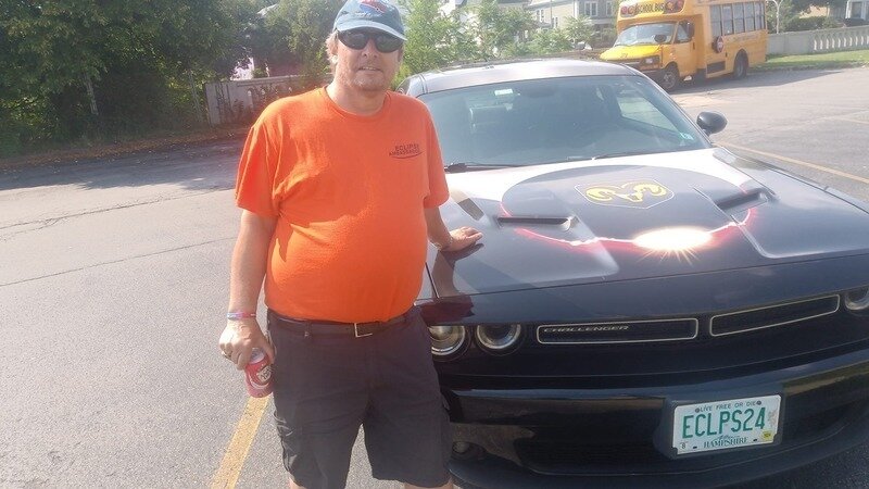 I spent the day yesterday moving about Buffalo with the self-styled “Eclipse Evangelist” Rik Yeams. Rik is the most enthusiastic eclipse enthusiast I have ever met! He is also an Eclipse Escapader. We traveled about in an EclipseMobile, a Dodge Challenger with a diamond-ring, Baily—beaded total solar eclipse image on the hood, and a picture of what our sky will look like at 3:20 PM on April 8, 2024 on the trunk. Did you know that two to three planets will be visible at mid-day during totality? He has the whole totality picture painted on his trunk. Rik even plans on having an “eclipse roof” installed in the EclipseMobile, a top that is nearly opaque but is translucent in the same way that eclipse protective eyewear is. The eclipse roof will make it possible to view an eclipse from inside the car without protective eyewear.