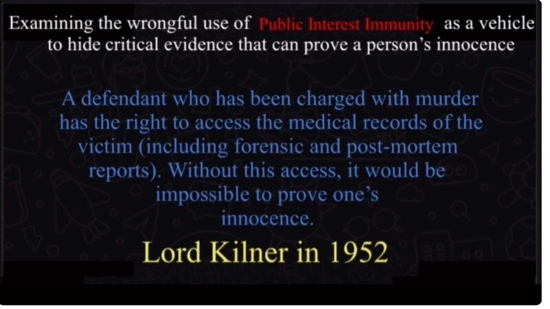 Lord Kilner in 1952 acknowledged the importance of truth, honesty and transparency in criminal cases. Murder suspects should have access to ALL documentation, especially documentation that contains proof of innocence. If these vital documents have been hidden under unlawful P.I.I. (public interest immunity) clauses and fabricated evidence has replaced these documents to deliberately entrap an individual, then the higher courts need to step in. Unlawful use of P.I.I. not only damages the public interest. but leads to an unfair trial which in turn results in an unsafe convictions. Courts that do not uphold the purity of the law, but instead engage in unethical means to secure a conviction at all costs as a vehicle to protect their other interests insult the public tax payers, the public interest and victims.