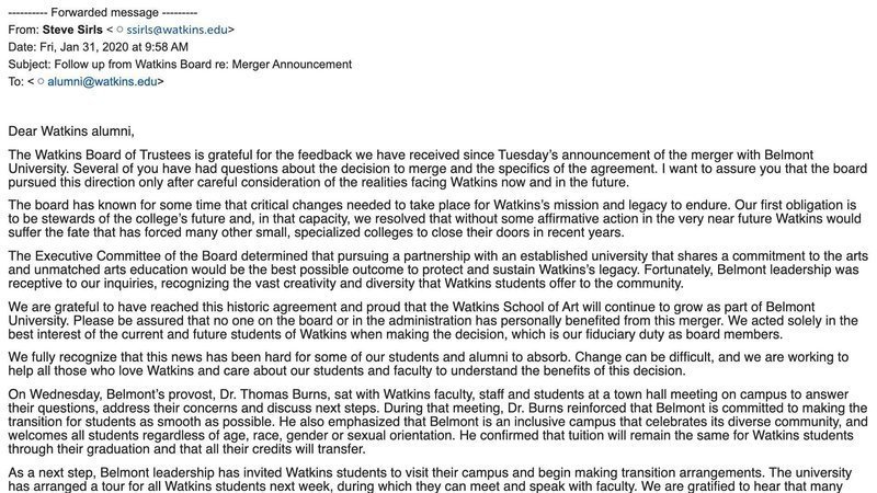 We are grateful to have reached this historic agreement and proud that the Watkins School of Art will continue to grow as part of Belmont University. Please be assured that no one on the board or in the administration has personally benefited from this merger. We acted solely in the best interest of the current and future students of Watkins when making the decision, which is our fiduciary duty as board members.