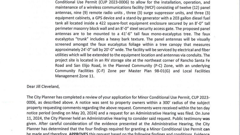 The City Planner Eric Lardy ( Eric.Lardy@carlsbadca.gov, 442-339-2712) granted Verizon permission to build the cell tower right across the street from Solaire and next to the future Memory Care facility.