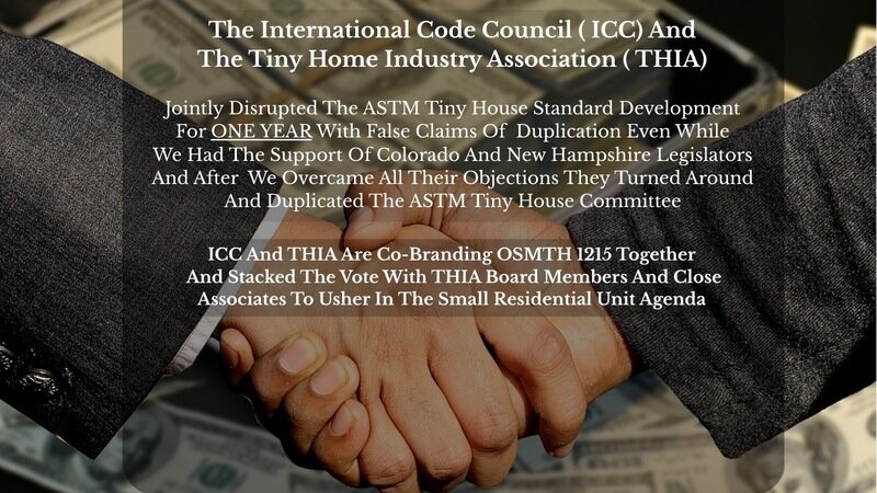 The short version is that the International Code Council and a trade association called the Tiny Home Industry Association ( THIA) jointly fought the formation of an ASTM committee on tiny houses for a year with a false claim of duplication. It is important to note that David Tompos Sr. was not only on the board of THIA, but paid staff of ICC, and the VP of ICCNTA, a third party inspection, certification, testing lab, with engineering services.