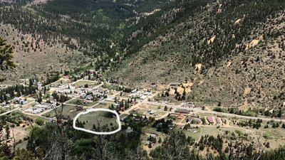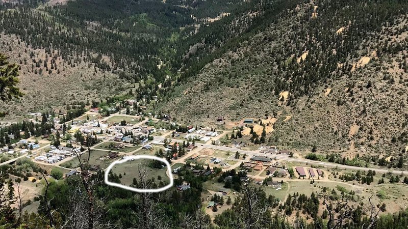 The photo shows our quaint little mountain town, and the circled area is the 3.2-acre hill that the developers desire to cram with 21 homes.