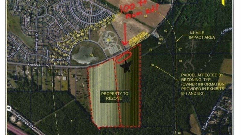 The proposed treatment plant will be placed 100 feet from Center Hill road behind the tree line. Per the diagrams shared last night, this is directly across from the Elementary schools parking lot. Developers stated they cannot build this further back because of the flood plain and wetlands further back on the property.