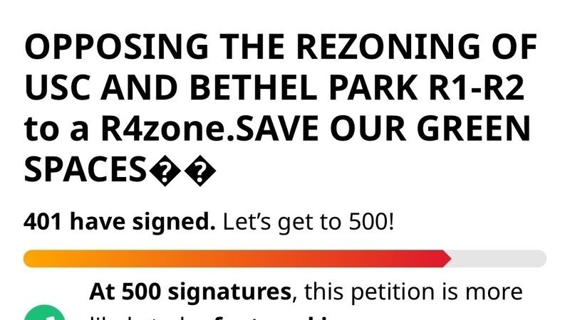 OPPOSING THE REZONING OF USC AND BETHEL PARK R1-R2 to a R4zone.SAVE OUR GREEN SPACES��