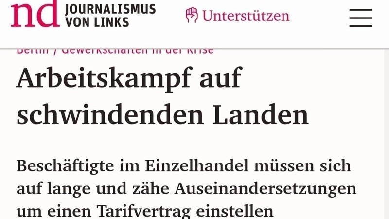 Die Tageszeitung "Neues Deutschland" (nd) widmete am 11. August 2023 einen längeren Artikel zum Tarifkonflikt im Einzelhandel. Neben dem Stand der aktuellen Konflikte zwischen ver.di und den Unternehmensverbänden um die Erhöhung der Löhne und Gehälter in der Branche, lässt nd Orhan Akman mit vielen Zitaten zu Wort kommen.