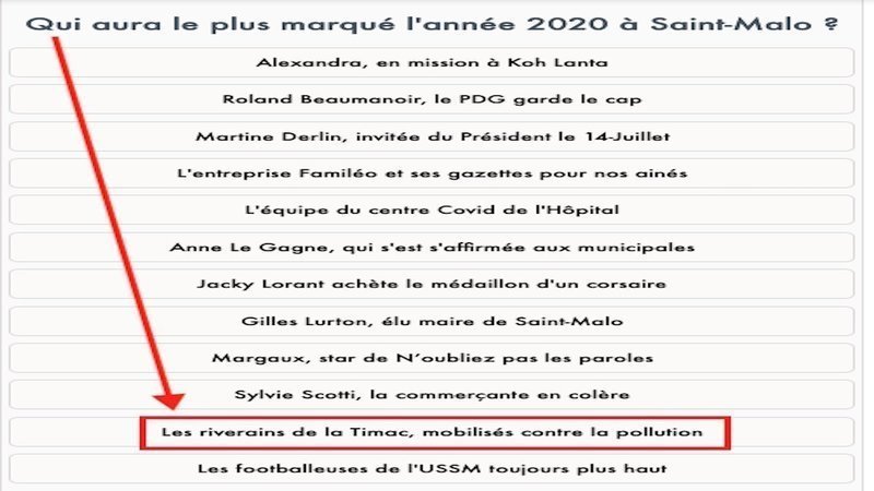Sans aucune hésitation, celles et ceux qui ont osé demander la lumière sur ce que chaque Malouin·e respire chaque jour depuis un demi-siècle ! Votez sur le site de Ouest-France Saint-Malo pour « Les riverains de la Timac, mobilisés contre la pollution » ☞ https://www.ouest-france.fr/bretagne/saint-malo-35400/saint-malo-votez-pour-la-malouine-ou-le-malouin-de-l-annee-2020-7094166