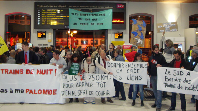 * Le train de nuit Paris-Nice(-Vintimille) est menacé au 1er octobre. D'après les informations dont nous disposons, il serait facile de le sauver. Et cela permettrait en plus de pérenniser le Paris-Briançon puisqu'étant attelés ensemble, ils optimisent les coûts. Nous recherchons des usagers sur PACA pour lancer les premières actions : c'est facile, merci de nous contacter.