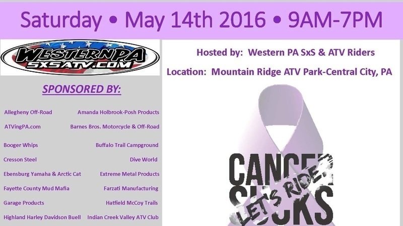 May 14th is right around the corner and Mountain Ridge ATV Park in Central City, PA is ready and waiting for YOU! The 2nd Annual Cancer Sucks Ride is one of the best rides in PA in 2016 so don't miss out! Make plans today to attend! We have over $7,000 worth of giveaways for the Chinese Auction, Cancer Sucks Tshirts, 50/50 tickets and miles of great riding for this event! Registration will be from 8:00-10:30 and you will be able to purchase Chinese Auction & 50/50 tickets during this time. There will be TWO food trailers serving breakfast, lunch, and dinner at great prices! (D.J.'s Concessions and Pappy D's BBQ) Registration area will be held in the large tan pole building and everyone is to meet back there at 1:00 sharp for the giveaways.....you MUST be present to win! No registration and no insurance is required but helmets are a must! When you arrive, head to the registration area to sign the waiver form and get your wristband to ride for the day. What a great way to raise money for the cure to such a horrible disease...CANCER SUCKS! Our goal is to raise $10,000 this year for The American Cancer Society......help us reach this goal! Hope to see you there! For more information go to www.mountainridgeatvtrails.com