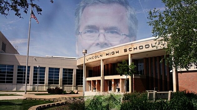 Paint a mural of Jeb Bush spanning the roof of Lincoln High School