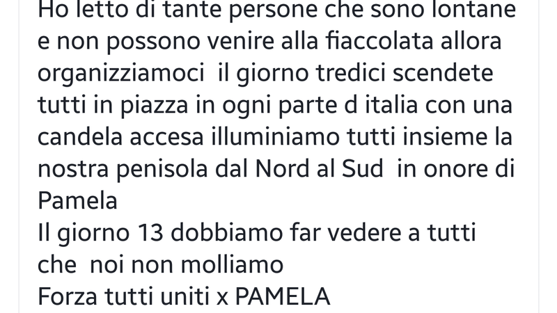 Carlo Ronzio fa parte del gruppo per Pamela "VERITÀ E GIUSTIZIA PER PAMRLA MASTROPIETRO" su Facebook e propone con il cuore questa idea: chi non può essere a Roma il 13 aprile per la fiaccolata, scenda nella piazza del suo paese e/o città ed accenda una fiaccola lì dove si trova!!!!