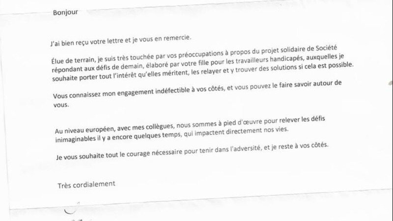 Je vous remercie de votre soutien ; vu que je vous annonce une nouvelle d'encouragement car ma mère vient d'obtenir une réponse de sa démarche auprès de la Députée européenne Virginie JORON qui m'annonce qu'elle ce tient à nos côtés pour tenir dans l'adversité. Voir image ci - dessus.
