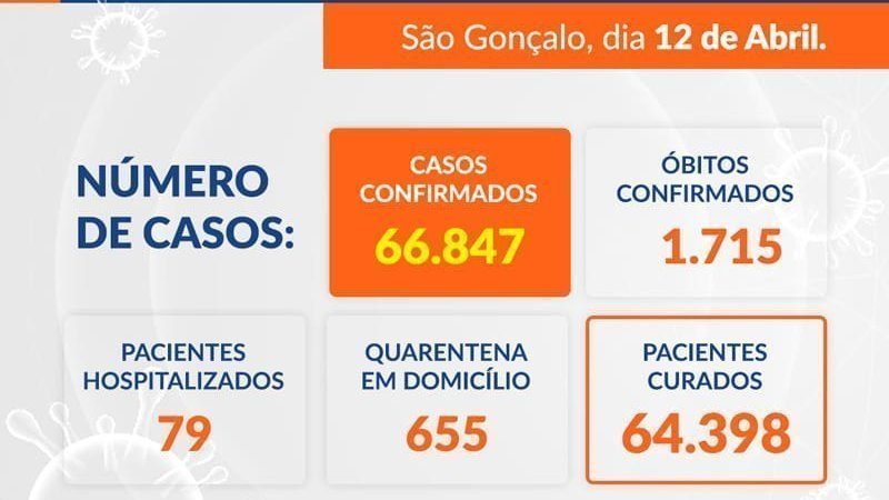 Até o momento, São Gonçalo contabiliza 66.847 casos confirmados, 64.398 curados, 79 hospitalizados na Rede Pública Municipal de Saúde, 655 em quarentena domiciliar, 130 óbitos em investigação e 1.715 óbitos confirmados. (dados atualizados em 12/04/2021)