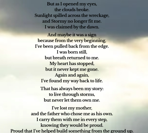 I wrote this poem, Born of the Storm, Claimed by the Sun, to share what resilience and survival mean to me. It’s not just my story—it’s for anyone who has ever felt like the storm might win, but still found a way back to the light.