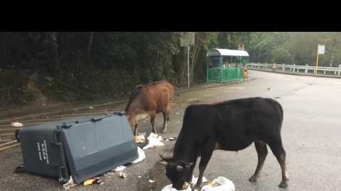 Walked out to the roundabout this morning at the entrance to the Hoi Ha Wan Marine Park and discovered some of the feral cows having their breakfast. In fact the rubbish bins at Hoi Ha are knocked over on a daily basis with the boars, monkeys, and who knows what eating the trash. This in fact happens in the villages all over AFCD's Sai Kung Country Park every single day and has been going on for years. At least this one cow was able to realise he was eating plastic and spat it out...poor guy!