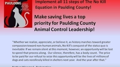We are an animal advocacy movement, asking for the 11 steps of 'No Kill' to be implemented in our Paulding County, Georgia Animal Control Facility. We want to save all healthy and treatable homeless pets in Paulding. We want to increase our save rate from 45% to 90+%.