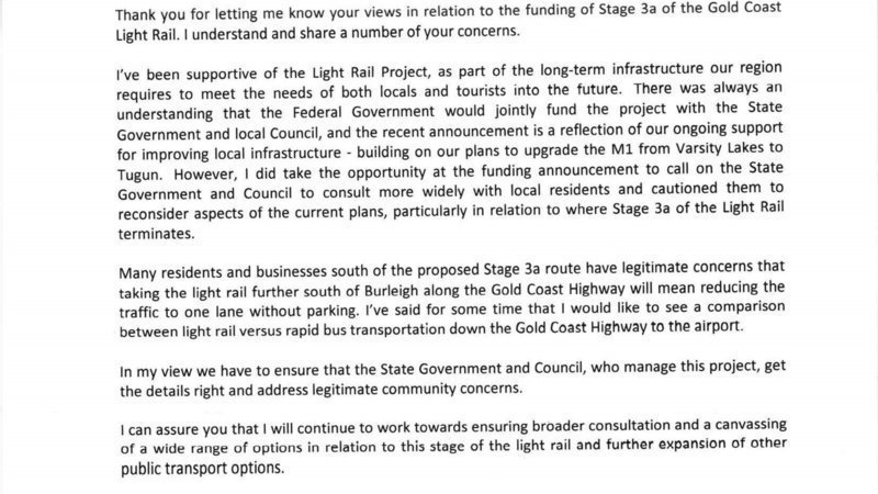 Local federal member Karen Andrews has been on the public record that she did not see the light rail going past Burleigh and it would not connect to the Airport.