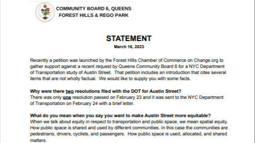 The Queens Community Board 6 has released a statement about a petition put together by the Forest Hills Chamber of Commerce, in an effort to counter our very own. This petition states a lot of falsehoods and misrepresentation of what the Community Board passed as well as what our campaign is pushing for. The petition also makes light of the pedestrian hazards on Austin Street and seeks to downplay the dangers we all see every day.