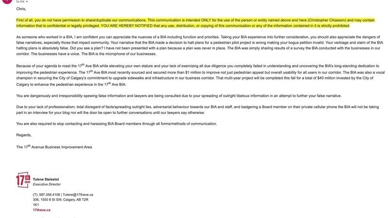 Yesterday afternoon, I received the attached email from Tulene Steistol, the Executive Director of the 17th Ave BIA.