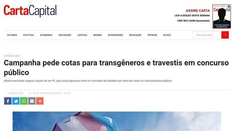 Bulletin d'alertePELA INCLUSÃO DE PESSOAS TRANS NO MERCADO DE TRABALHO!Saiu na CartaCapital! Campanha pede cotas para transgêneros e travestis em concurso público